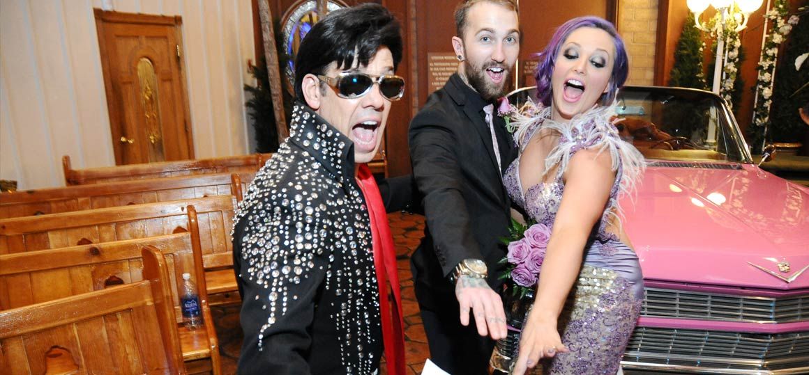 If you want to make a spectacular entrance on your wedding day in Vegas, let Elvis drive you right down the aisle of our Viva Las Vegas Wedding Chapel in a gorgeous 1964 pink Cadillac convertible! Rockin' Elvis theme music, fog and theatrical lighting effects make the atmosphere even more electric as Elvis's vintage car shoots through our main doors. But no kidding, your guests will be on their feet cheering, and friends and family watching on the Internet will simply be blown away. Elvis then escorts you to the altar, where he'll perform the ceremony as well as three legendary songs. The unbelievable energy of this phenomenal wedding package culminates as guests join you dancing in the aisle to Viva Las Vegas. It's truly the wedding experience of a lifetime!